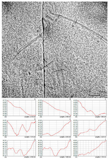 Second, a hillshade was created using the shading tool (Applications/Shaded Relief). In this case, the program allows you to enter the slope in the X and Y directions. The initial values (15 and 12 microns) are automatically calculated from the average slope within the image. However, the smaller these are, the greater the shading effect. Therefore, it was decided to use a value of 5 microns in both directions. The position of the light source was left by default. The result was an image in grey levels (see Figure 5c) with associated data from the original DEM, which allowed us to measure the grooves of the engraving. The tool used was the Line Profile Plot (Functions/Plot/Profile). Figure 8 shows 9 outlines of the lines, on the mane, ears, forehead, snout, jaw, and neck. The hillshade layer is frequently used in cartography to give an impression of depth and to facilitate the interpretation of the relief and is often combined with other layers of information to improve its visualization. The image in Figure 8 shows the result of applying the hillshade layer overlay with a transparency of 35% on the high pass layer. In addition, in Figure 5d, it is superimposed applying the same transparency on the orthophotomosaic.