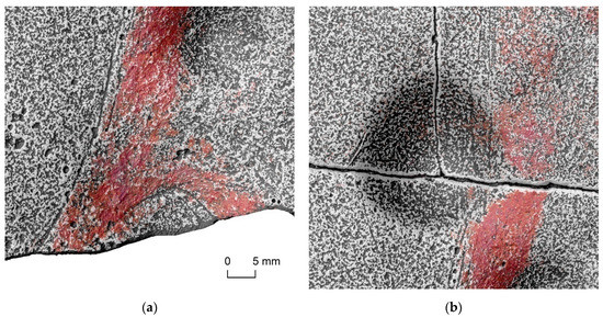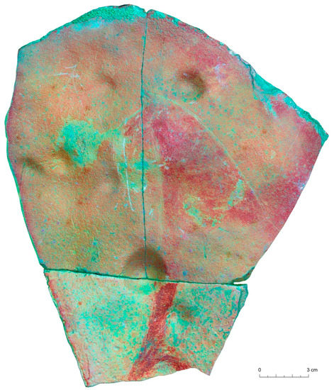 We have worked with the plug-in DStretch Version 8.22. The procedure begins with a representative area selection on the image of the piece (orthophotomosaic of Figure 1), the definition of the intensity scale and the choice of the color space with which the decorrelation algorithm manages to emphasize the areas of interest. In most cases, it is necessary to select several color spaces to highlight different aspects. The color space used to emphasize the red paint is LRE (Figure 5g and Figure 9). Additionally, good results have been obtained to isolate traces recorded with the DStretch-YRE enhancement (Figure 5h). The different classified images are saved in TIF format together with their corresponding matrix file (.txt) with information on the transformation carried out. This file will be used later and contains the chosen color space, the 9 coefficients of the covariance matrix, and the mean color value of the image selection.