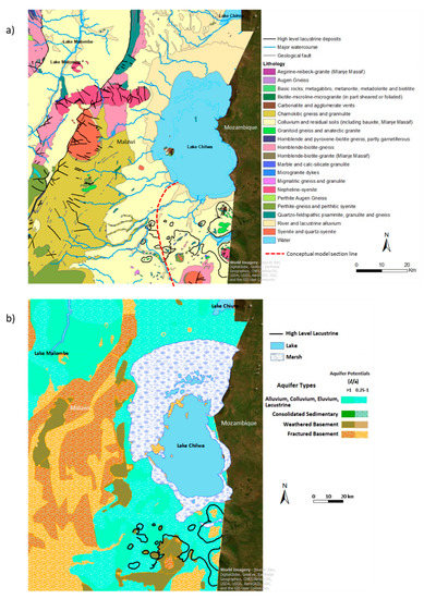 Lake Chilwa Basin WRA 2 study area: (a) Solid and superficial deposit geology (digitized, adapted and reinterpreted from Garson and Walshaw [31]); (b) classification of aquifer types (adapted from the Malawi hydrogeological and water quality 1:650,000 Map (2018) produced by the Council for Geoscience, Republic of South Africa (publ. Gov’t of Malawi, MoAIWD National Water Development and Shire River Basin Management Programmes).