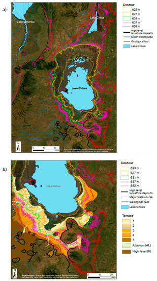 Estimated former Lake Chilwa extent based on relict shoreline elevations contoured over current ground surface shown against a backdrop of High Level and Lake Terrace deposits (locations of these deposits are based on Garson and Walshaw [31]) for: (a) Lake Chilwa Basin area; (b) close-up of Phalombe District and surroundings. Data are shown over a satellite image backdrop.