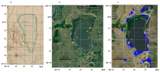 The extent of Lake Chilwa mapped by the Livingstone 1859–1863 expedition is shown in Figure 4a (part of Livingstone’s much larger map that also covered Lake Malawi [52]). A distorted lake outline is apparent relative to its modern satellite image (Figure 4b), albeit less distorted than earlier sketch/draft expedition maps (Livingstone Online [53]: liv_000078 and liv_0140357; and the Royal Geographical Society (RGS): RGS-IBG mr Malawi S.5 (1)). Mapped differences are largely attributed to historical mapping inaccuracies rather than actual changes in lake extent over the intervening 160 years. Lake access difficulties faced by Livingstone due to mountainous terrain, swampland and hostile populations [54] meant much of the lake perimeter may have been mapped from distance. Certainly the earlier (1859) RGS map referenced above was mapped from point B’ (Figure 4a) and surrounding higher vantage points set back from the western shoreline.