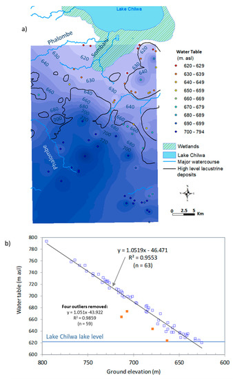 (a) Contoured potentiometric surface (water table) at 10 m intervals for the Phalombe District based on water level data mostly from 2017; (b) plot of water table versus ground elevation. The four outliers are excluded from the spatial data, but included in Figure S6, where the most marked outlier causes a central western margin flow-field sink anomaly.
