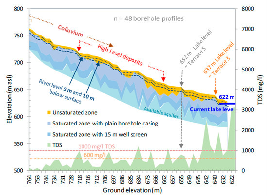 Hence the high-level deposit line effectively demarks low-TDS, good-quality water to its south, transgressing into usually poorer quality, higher-TDS groundwater to its north and closer to the lake. Boreholes within the central to eastern area of the high-level and terrace increase in TDS in the general direction of groundwater flow towards the lake. Boreholes of highest salinity (>1500–4300 mg/L TDS) track close to the 652 m elevation contour and terrace 5 deposit line (Figure 9). Closer to the lake salinity declines in boreholes penetrating lower numbered terrace deposits but still remains significant at 1000–1500 mg/L TDS.
