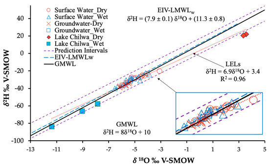 Basin-scale stable isotope surface water (river) signatures plot close to the Global Meteoric Water Line (GMWL) defined by the relationship of δ2H = 8δ18O + 10 [56]. (Figure 7 seasonal data). The isotopic signatures are consistent with the closest available local precipitation spatial variation, we have recently reported across the Shire River Basin that are defined by the shown Local Meteoric Water Line of δ2H = 7.9 (±0.1) δ18O + 11.3 (±0.8) [47]. All surface-water samples plot along meteoric water lines (EIV-LMWL; GMWL) and within the prediction intervals during the wet season, providing strong evidence of non-evaporated precipitative recharge input into surface-water bodies.