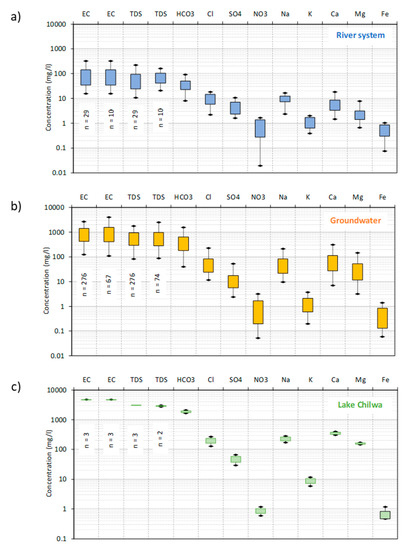 Observed hydrochemical interquartile plots for Phalombe District: (a) river water: (b) groundwater; and (c) Lake Chilwa. EC data are shown for site measurements for both the entire datasets and subset of samples analysed for major ions. TDS data are shown for all on-site measurements and a calculated TDS summed from laboratory ion concentrations analysed (smaller n number that also applies to the individual ion datasets).