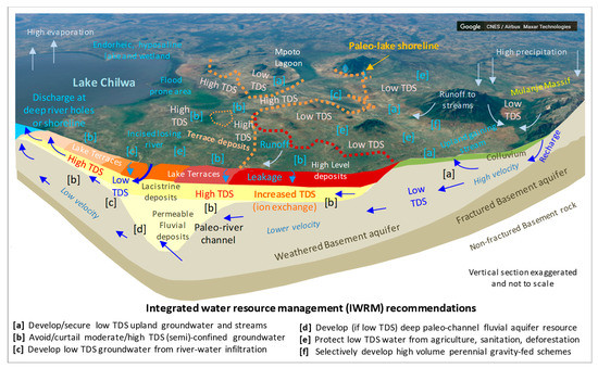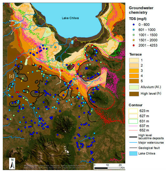 - Development, of low-TDS groundwater in the lowland lake terrace areas where this (i) locally occurs within aquifer units recharged by infiltration of low-TDS river-water (label [c]), or (ii) exists in former river channel fluvial sand and gravels deposits at depth, e.g., towards the study area north-west—Phalombe estuary area (label [d]).