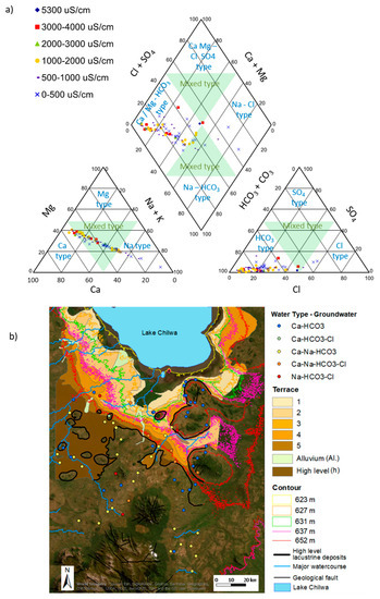 The spatial distribution of water type confirms the occurrence of young Ca-HCO3-type groundwater predominantly in the uplands recent recharge area outside the high-level deposit line (Figure 10b). Ca-Na-HCO3-type waters occur within, but also outside the High Deposit line indicating ion exchange is prevalent in both areas affecting both low- and higher-TDS waters. This is attributed to an increasing occurrence of clay lithologies in high-level and terrace deposits closer to the lake, and occurrence in the weathered basement accounting for Ca-Na-HCO3-type waters beyond the high-level deposit line. This may likewise account for the lack of obvious relationship of Piper plot trends with TDS. Whilst the water types with minor chloride in some, but not all, samples track along upper terraces 3 to 5, the 631 m closed lake contour (Figure 10b), the salinity of the system appears largely driven by higher concentration occurrences of the Ca-HCO3 and cation exchanged Ca-Na-HCO3 water types. Limited groundwater chloride is consistent with low chloride as a constituent of silicate rocks, the lack of evaporite deposits in the Basin, and limited input from rainfall anthropogenic sources such as pit latrines and agriculture [18,58].