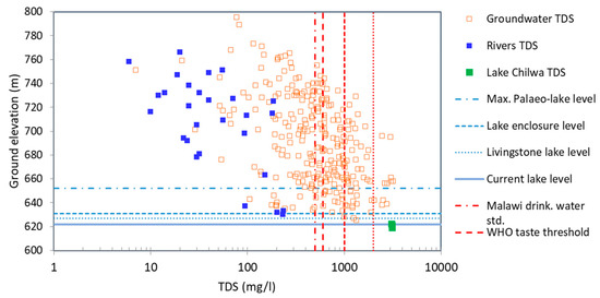 - General avoidance and curtailing of community drinking water supplies from most groundwater that is confined or semi-confined by the high-level and particularly lake terrace deposits; although some groundwater may meet less stringent Malawian standard, most would breach the WHO threshold for brackish water ideally met for drinking water supply (label [b]).