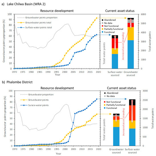 Central to the overarching Climate Justice Fund–Water Futures Programme (CJF), under which this research has been conducted, is the development of a national Management Information System (MIS) for the Government of Malawi to assist in proactive management of its water supply and management infrastructure assets [21]. The MIS, hosted on the mWater platform (www.mwater.co) (referred to herein as ‘mWater’), has been populated via a joint Government of Malawi and CJF comprehensive evaluation of all rural water points across Malawi, numbering over 120,000 points. Data are obtained through trained Malawian Government enumerator site visits and completion of formal assessment questionnaires to establish functionality status and controlling factors with community Water User Association representatives or others holding water points. We draw upon mWater data at both Chilwa Basin (WRA 2) and Phalombe District levels of assessment of water point type occurrence, year of installation, functionality status, registration of water quality concerns, borehole depth and supply flow rates observed.