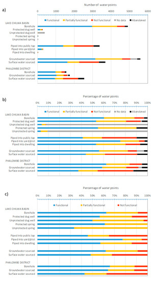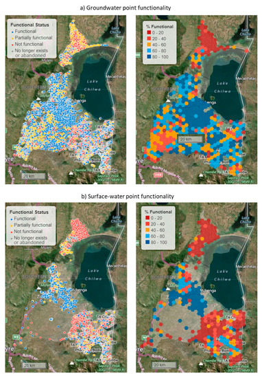 - Truslove, J.P.; Miller, A.V.M.; Mannix, N.; Nhlema, M.; Rivett, M.O.; Coulson, A.B.; Mleta, P.; Kalin, R.M. Understanding the Functionality and Burden on Decentralised Rural Water Supply: Influence of Millennium Development Goal 7c Coverage Targets. Water 2019, 11, 494. [Google Scholar] [CrossRef]
