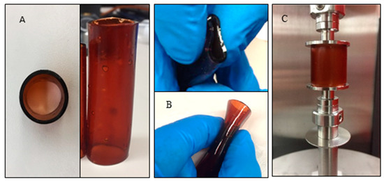 For each formulation, OPF, phenyl bis (2,4,6-trimethylbenzoyl)-phosphine oxide (BAPO) as a photo initiator, and CH2Cl2 were combined into a flask according to Table 1. The mixture was vortexed until all solutes were dissolved. As a cylindrical mold, a metal rod of 12 mm in diameter was fabricated to construct the inner diameter of the OPF hollow cage. After greasing the metal rod, the resin was added to the mold. The mold containing the resin was placed in a UV oven to initiate crosslinking. After 1 h, the center metal rod of the mold was removed and the hollow cage placed back in the UV oven for an additional 2 h. The cage was placed in the fume hood at room temperature overnight to fully dry.