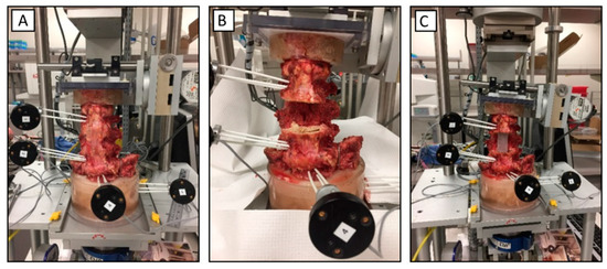 Kinematic motion testing setup; (A) intact spine; (B) spine after corpectomy; and (C) spine after placing the poly (methyl methacrylate) (PMMA) rod between L2 and L4.