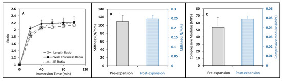 Mechanical testing was successfully performed on the cage specimens before and after expansion and the results are shown in Figure 3B,C. After expansion, the cages became very soft and flexible; the stiffness of the cages dropped drastically from 110 N/mm to 0.25 N/mm after swelling (Figure 3B). Similar outcomes were observed in the elastic moduli of the unexpanded and expanded hollow cages, about 54 MPa, and 0.05 MPa, respectively (Figure 3C).