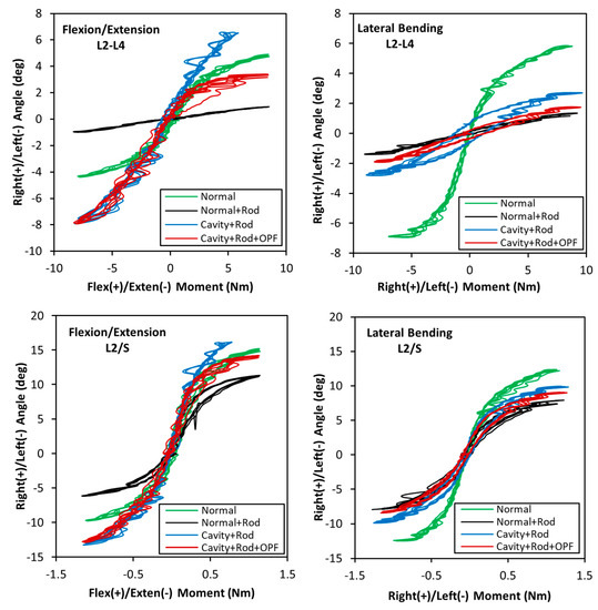 Figure 4 illustrates the bending angle outcomes vs. the applied moments for two loading conditions, flexion/extension and right/left lateral bending. Data were recorded for all four scenarios including a normal/intact spine, normal with posterior fixation, corpectomy with posterior fixation, and fixation with corpectomy plus cage.