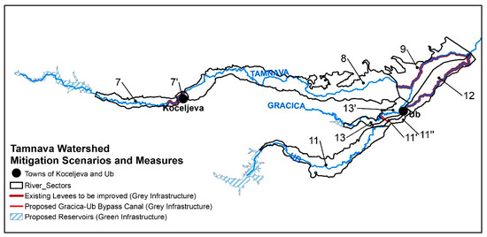 - Reinforcement and crown elevation of the existing levees along the Tamnava and Ub, in sectors 7′, 9, and 12, respectively (Figure 3). Additionally, construction of a bypass canal connecting Gračica and Ub rivers (sector 13′) is proposed. All of the above measures are referred to as grey flood protection measures in this study. Locations of the proposed mitigation measures are depicted in Figure 3. The existing levees that already provide certain level of flood protection are planned to be elevated as follows: