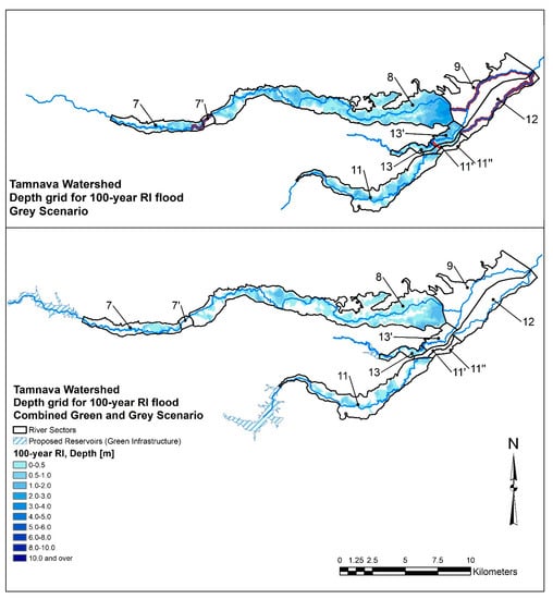 - Green-grey scenario includes implementation of both green (detention basins) and grey measures (heightened levees and the bypass canal) in the watershed.