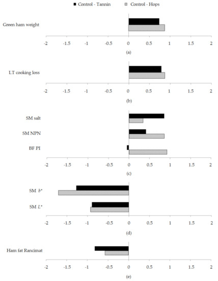Large effect sizes (Hedge’s g > 0.8) of carcass traits (a), water holding capacity (b), chemical composition (c), color (d), and oxidative stability (e) denominating the strength of 0.4% hops (Hops) or 3% sweet chestnut wood extract (Tannin) supplementation (LT: Longissimus dorsi; SM: Semimembranosus; NPN: Non-protein nitrogen; BF: Biceps femoris; PI: Proteolysis index; b*: CIE yellowness; L*: CIE lightness).