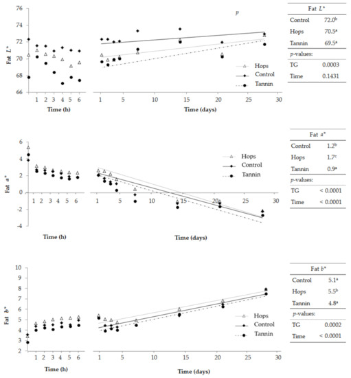 Objective color parameters: CIE lightness: L*, redness: a*, and yellowness: b* of fat of dry-cured bellies during refrigerated storage with lsmeans and p-values for treatment group (TG) and time effects (abc intercepts ascribed different superscript letters are significantly different at p-value < 0.05).