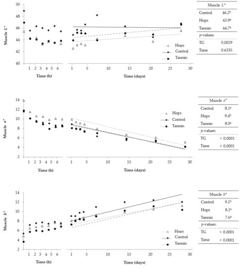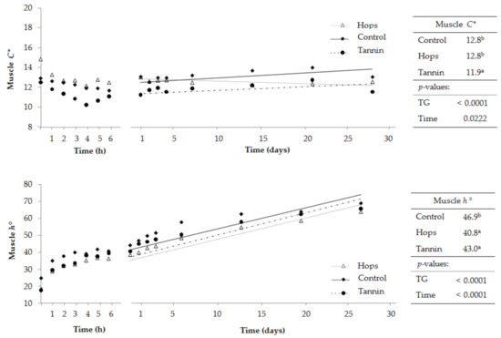 Objective color parameters: Chroma: C* and hue angle — h° of muscle of dry-cured bellies during refrigerated storage with lsmeans and p-values for treatment group (TG) and time effects (abc intercepts ascribed different superscript letters are significantly different at p-value < 0.05).