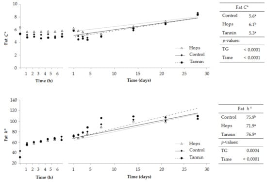 Objective color parameters: Chroma: C* and hue angle — h° of fat of dry-cured bellies during refrigerated storage with lsmeans and p-values for treatment group (TG) and time effects (abc intercepts ascribed different superscript letters are significantly different at p-value < 0.05).
