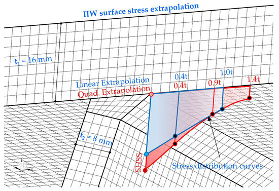 In this study, both linear and quadratic stress extrapolation are implemented on an RD joint of the OSD specimen. After the evaluation of stresses at specified reference points, the following equations are used for the calculation of SHSS. If the linear extrapolation is performed using stresses