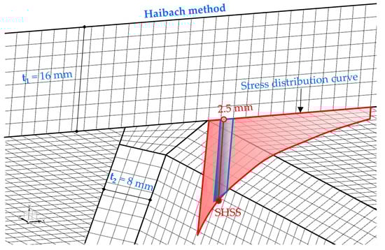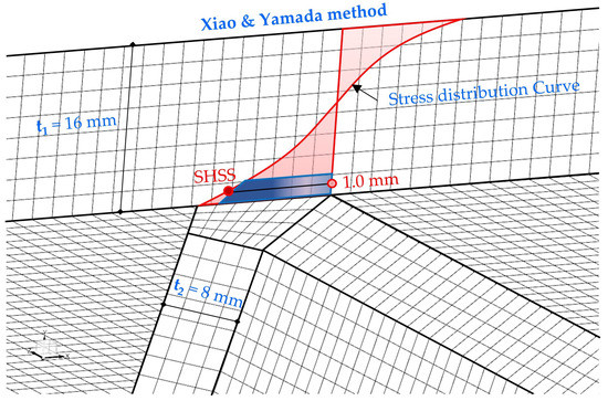 Figure 3. The SCLs are typically located at the gross structural discontinuities, but for the evaluation of local stresses, SCLs are positioned at the local structural discontinuities, i.e., the weld-toe or the weld-root of the RD joint. It is important to mention that, in this study, Simpson’s integration rule was applied for the stress linearization at the weld-toe. The stress components normal to the weld-toe were used for SHSS evaluation (i.e., normal stress