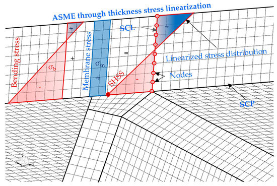 If shell elements are used for SHSS evaluation, then the membrane and the bending stresses can be obtained directly from the stress resultants. The membrane and the bending stresses are developed on the cross-sections through the thickness of the plate; these sections are called stress classification planes (SCPs). The method to derive the membrane and the bending stress components from a linearized stress distribution is shown in