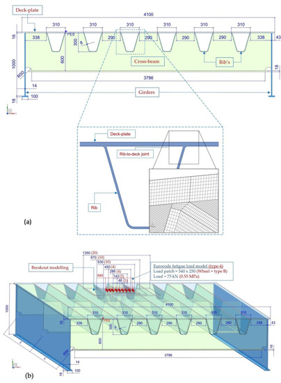 Figure 5a,b. The OSD models were simulated and tested on a finite element method (FEM) based software Siemens NX.12.0. The OSD model consists of a deck plate, cross-beams, longitudinal-ribs, and girders. It has stress reliving cut-outs with a 16.0 mm thick deck-plate and 8.0 mm thick trapezoidal longitudinal-ribs. It has six longitudinal-ribs and three cross-beams with 600.0 mm and 4000.0 mm centre-to-centre spacing, respectively. The cross-sectional details of this OSD model are shown in