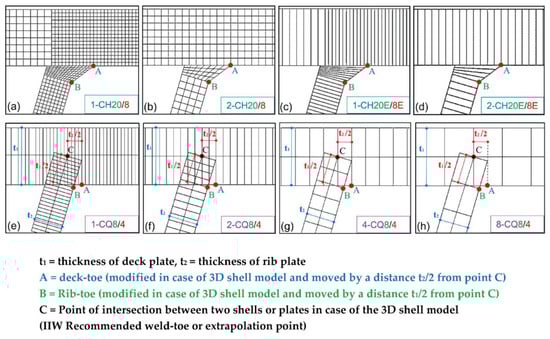 Figure 6a–h. These were named considering mesh size and element type, e.g., 1-CH20 mesh variation stands for 1.0 mm 20 node cubic parabolic hexahedral solid element. Similarly, 8-CQ4 is the abbreviation of an 8.0 mm 4 node cubic linear quadrangle shell element. A minimum of three layers of elements were used over the thickness of the plate for linear (1/2-CH8) and parabolic hexahedral (1/2-CH20) elements. This ensured the uniformity of stress distribution through the thickness of the plate and reduced the stress singularity effects, especially near the sharp notches. It is important to mention that coarser mesh types (e.g., 4/8-CQ4/8) are only applicable to LSE 515 and ASME TTSL methods, because other SHSS methods have mesh size limitations. The weld connections are only modelled in 3D solid models, whereas 3D shell models welds were not modelled as per IIW recommendations given in Ref [