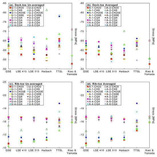 Figure 9a,b). Similarly, Xiao and Yamada’s method did not have much influence of nodal averaging in the case of the rib-toe, whereas the deck-toe showed significant decrease in SHSS results in 2-CH20/8 elements, which was evident in the 2-CH8 element (