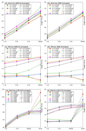 Figure 7a–d. The reduction in SHSS was more pronounced in the 2-CH8 element. The coarser mesh (i.e., 4/8-CQ4/8) was only applicable to LSE 515, as other SSE methods have mesh size limitations, but their results were not convincing, especially for linear elements (4/8-CQ4). Moreover, nodal averaging had a major influence on their SHSS results. Overall solid elements (1/2-CH20/8 and 1/2-CH20E/8E) showed lower and slightly scattered results, especially in linear elements (1/2 CH8/CH8E), whereas shell elements (1/2-CQ8/4) showed higher and consistent SHSS results for both cases (i.e., deck and rib-toe).