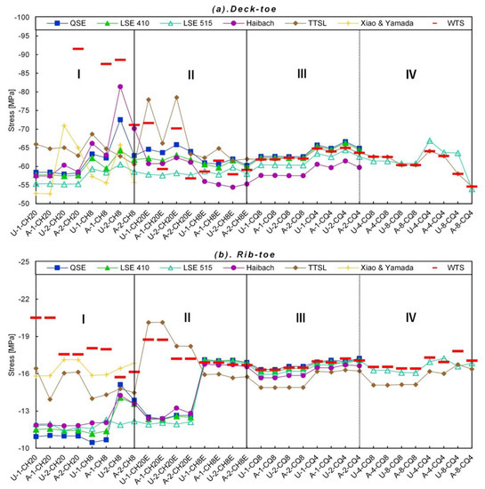 Figure 9a,b). The WTS is a definite nodal stress determined at the weld-toe in the deck and the rib-plate. The detailed analysis of the results for each method is discussed in the following section.