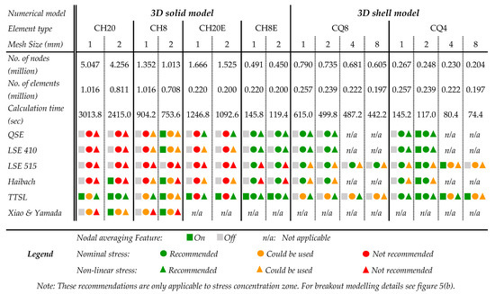 Figure 9a,b). Similarly, the 1/2-CH8 elements showed scattered SHSS results for all the evaluation methods, because they had scattered stress results at the readout points. Therefore, while applying these SHSS methods considering different element types, it is more important to analyse the stress results at the reference extrapolation points rather than focusing on high WTS results. Moreover, the computation time is an important factor to consider, e.g., the 1-CH20E element (44,14,778 nodes) had three times fewer nodes as compared to the 1-CH20 element (16,66,396 nodes) for the same simulated OSD model, Hence, it is better to use the 1-CH20E element for SHSS evaluation to save computation time and analysis cost. In general, shell elements (CQ8/4) had more consistent SHSS results as compared to solid elements (CH8/20 and CH8E/20E) for both cases (