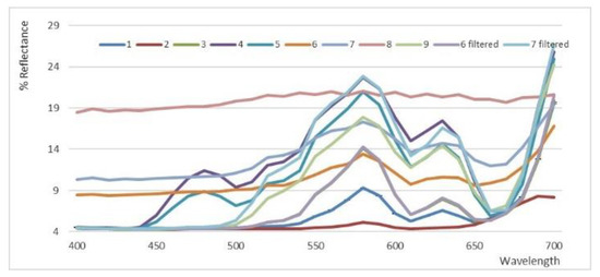Spectral reflectance curves obtained by CIEL*a*b* analyses applied to 1–9 hemp seed oils. Samples 6 and 7 were measured after filtration.