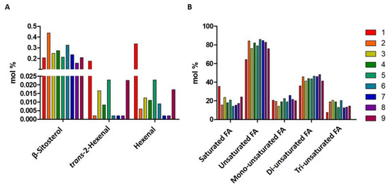 Histograms resulting from the quantitative NMR analysis of (A) β-sitosterol and aldehydes, and (B) fatty acids. The relative molecular abundances (molar percentage) are reported.
