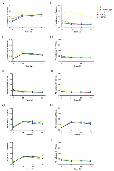 Absorbance (λ 500 nm) of lipoperoxides produced in different hemp seed oils, with respect to linoleic acid (A) under multiple storage conditions and incubation times (t = 0, 24, 48, and 72 h). Hemp seed oils: (B) 1, (C) 2, (D) 3, (E) 4, (F) 5, (G) 6, (H) 7, (I) 8, (J) 9.