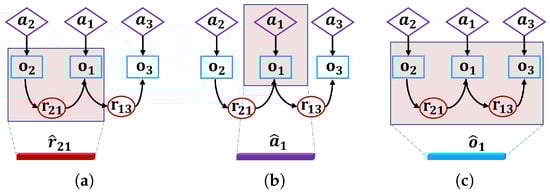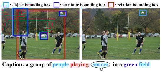 After that, the attribute feature and relation feature were obtained by another independent training on the GNOME dataset using the method used in []. Note that the attribute region shares the same area as the object region, as shown in the left subfigure of Figure 1, and the relation (composed of the triplet <subject–predicate–object>) region is the union of the subject region and the object region. We define the PBM priors for the attribute region and relation region as: