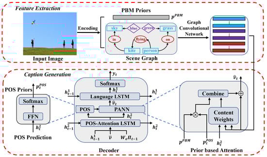 Attention Mechanism. When the RCNN (regional convolutional neural network) features or scene graph are chosen as the input image representation, the attention mechanism is often adopted in the decoder to attend the related regions and further extract currently needed visual information for each word generation. These works could be sorted based on the attention network structure and the attention weight calculation method. (1) Single layer vs. multi-layer (see, for example, studies [,,,,,]) employs a single layer implement of an attention mechanism by taking the hidden state as the query vector to extract visual features at each step, while the studies [,,,,] chose a multi-layer attention implementation in their decoder. (2) Involving extra clues in attention weights or not—for example, studies [,,] obtained their attention weights only from previous attention calculations, while the authors of [] combined geometry clues with previously calculated weights into final attention weights. However, all of these works only tried to make full use of intrinsic existing clues to calculate the attention weights but ignored the impact of the PBM and POS priors.