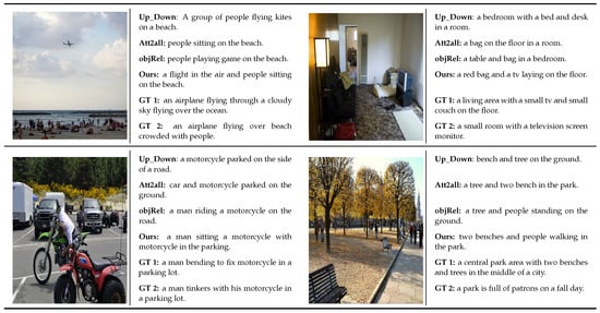 In this subsection, we will present our experiment results, which demonstrate that the proposed approach can enhance the performance for the task of image captioning. First, we selected several of the most representative state-of-the-art methods, which include both the regular image captioning decoder and transformer-based decoders. The comparison methods are briefly described as follows: (1) Up_Down [], in which a separate LSTM is used to encode the “past” word in an accumulated manner, and an attention mechanism is utilized at each step of the word generation; (2) RFNet [], which tries to fuse encoded features from multiple CNN models; (3) GCN-LSTM [], which predicates visual relationship clues in each entity pair and encodes this information into feature vectors through a message-passing mechanism; (4) Att2all [], which maximally reserves the structure from the transformer design for machine translation; (5) AoANet [], which proposes an “attention on attention” module to determine the relevance between attention results and queries; (6) ObjRel [], in which the geometry is involved in encoding for the purpose of exploring the spatial relationships among region proposals.