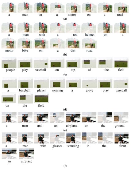 In the Figure 7, we visualize the region proposal with the highest attention weight at each time step of the caption generation process. We selected the [] as the “base” model and “base” + PANN as the comparison, and training processes were exactly the same using XE-loss, which has been discussed above. Observing the attended image region in Figure 7a,b, we found that our approach could give a caption with more details than the “base” model; this is caused by the fact that the PBM priors could still remind the decoder of areas, such as “helmet”, though the decoder planned to ignore them, and POS priors could help the decoder select more relevant visual features, and thus our result could give more adjective words compared to the “base” model. Similar situations can bee found in Figure 7c–f, in which we can see that the LSTM [] with PANN could give the glove details, and the Att2all [] with PANN could give glasses details in their captions.