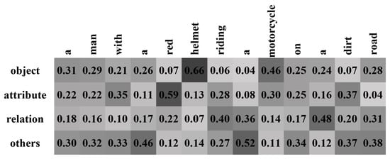 Recently, caption models tend to choose structural representation, i.e., Scene Graph, for input image features because of its advantage of being able to carry more detailed information. This is also inspired by the achievements [,,] made in the field of CV. In this way, it is possible to give a caption with more image details that could be utilized for some specific design, for example, for caption diversity. The Scene Graph consists of three kinds of heterogeneous image visual feature sets (the object feature set, attribute feature set, and relation feature set), which are included as nodes, with the connections of each node pair considered edges. However, it is a challenge to extract corresponding visual information at each time step of word generation from various region proposals and heterogeneous features. This is partly caused by the difference between the tasks of object detection and image captioning. The authors of [] proposed a method to incorporate three kinds of features into a single feature vector for each region proposal according to the existing connections in the graph so as to reduce the complexity, but some details may be lost in this method. In various studies [,,,], each kind of visual feature type and region proposal was treated equally, and an attention mechanism was applied to extract visual information. However, all of the above-mentioned works tried to compose their query vector in their attention module based on the hidden state of the decoder or the previous words while ignoring the PBM and POS priors’ impact for captioning, which could be used as a guide for visual information extraction.
