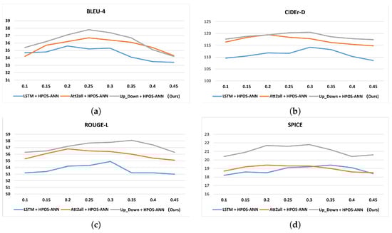 Performance affected by the trade-off factor of . In the above figure, we show 4 main metric curves obtained by different values of sampled from 0.1 to 0.5, with a separation distance of 0.05. The above figure (a–d) show the results under metrics BLEU-4, CIDEr-D, ROUGE-L, SPICE respectively.
