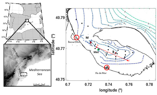 Location of the study area. The red circles show the two main points of freshwater discharges (Bassa de les Olles and Illa de Mar), the red diamonds show the points of measurement during the field campaigns (M: mouth; B: bay) and the green triangle shows the location of the meteorological station (Met) during FANGAR-II. The black point shows the conductivity, temperature and depth (CTD) profiles, the blue lines show the bathymetry and the red line (A–A′) shows the longitudinal section presented in Figure 9.