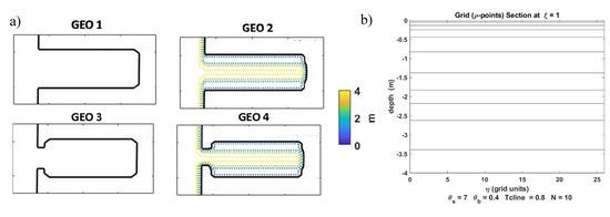 (a) Geometry and bathymetry for the four configurations used in the numerical experiments. GEO 1 and GEO 3 have 4 m of water depth. (b) Sigma layers used in the numerical model. The geometrical parameters are included following the stretching formulation described in Cerralbo et al. (2015).