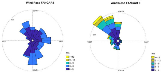 Wind roses of mean velocity for FANGAR-I (left) and FANGAR-II (right) during both campaigns. Wind intensities are grouped by intervals of 3 m·s−1.