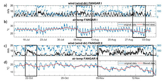 Wind direction and intensity from FANGAR-I (a) and FANGAR-II (c). Air temperature for FANGAR-I (b) and FANGAR-II (d). Air temperature is filtered to exclude daily variability. The black box shows the periods with falling air temperatures during NW winds.