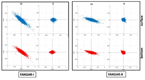 A dispersion diagram of the water currents (surface and bottom) measured by the ADCPs in each campaign is shown in Figure 5. The diagram shows how in the mouth (M station) the flow was aligned following the longitudinal axis of the bay. By contrast, in the B position the flow did not show a prevalent pattern, the water circulation being more complex. In addition, Figure 5 demonstrates how the water flow in the mouth was larger than in the inner bay. The maximum water currents measured in the mouth were 0.5 m·s−1 in FANGAR-I and FANGAR-II, but below 0.02 m·s−1 in both campaigns within the bay. Furthermore, the surface and the bottom signal showed similar patterns across the campaigns.