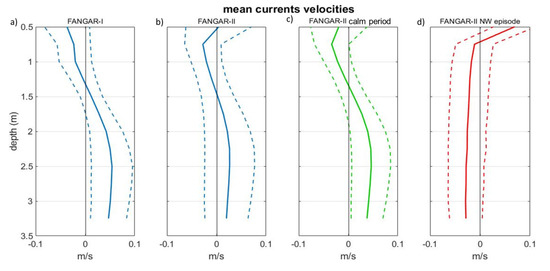 Regarding the flow alignment shown in the dispersion diagram (see Figure 5), the water current observations were rotated following the alongshore (longitudinal axis of the bay with positive inward) and cross-shore alignment. The rotation angle was equal to 35° for FANGAR-I and 15° for FANGAR-II (north clockwise negative) according to the flow alignment of the dispersion diagram. Discrepancies in the rotation angles probably owed to differences in the mooring location of the ADCPs. Figure 6 shows the alongshore time-averaged currents for each measurement layer of the ADCPs. The resultant profiles in the water column revealed a predominant two-layer structure during FANGAR-I (Figure 6a), indicating that estuarine circulation was the surface current leaving the bay (negative values), while bottom currents were entering (positive values). During FANGAR-II, the water circulation pattern was similar to FANGAR-I, aside from differences in surface values (above 1 m depth, Figure 6b) when averaging the whole period. However, after differentiating calm wind or sea breeze periods with those of the NW winds (i.e., E3 and E4), distinctions became evident. Indeed, during such periods the profile corresponded to the positive estuarine circulation pattern, normal behaviour in this type of geometry (Figure 6c), whereas when considering only the NW wind episodes that lasted the entirety of November, the water currents were negative (leaving the bay, Figure 6d) in almost all water column broking down the positive estuarine circulation.