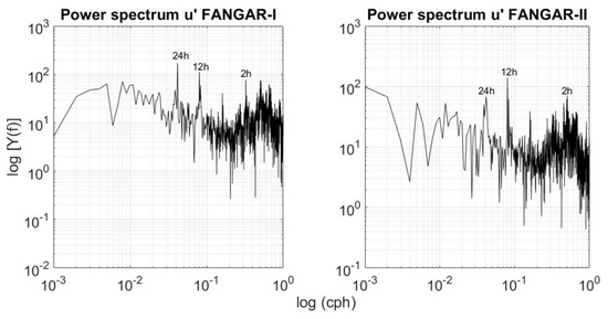 Spectral analysis of the signal of the alongshore current in the mouth for FANGAR-I (left) and FANGAR-II (right).