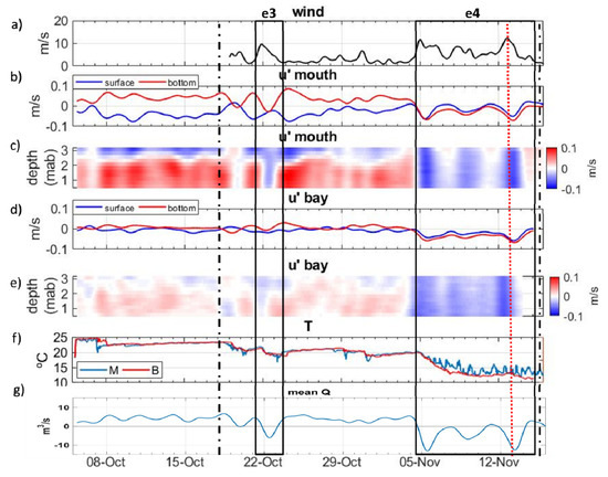 In order to conduct an episodic analysis, the time series were filtered using a 30 h Lanczos [31] to focus on the low-frequency signal. Figure 8 and Figure 9 show the rotated and filtered components of water currents jointly with wind, temperature and mean flow. Additional measurements of T and S are also shown in Figure 8, with Figure 8d,e and Figure 9c–e presenting the estuarine circulation mentioned previously, whereby the surface water flows out from the bay (negative and blue color) while the bottom water circulation enters (positive and red color). These periods were characterized by a strong stratification. This was due to the fact that the irrigation channels during FANGAR-I were open, contributing to the discharge of fresh water into the bay (Figure 8c). The same occurred at the beginning of FANGAR-II. Marked with a black box are the episodes of NW winds in Figure 8. Note that during these episodes, both temperature and salinity were homogenized (Figure 8b,c) and there was a change from positive estuarine circulation to homogeneous currents in the water column. Moreover, a substantial drop in sea bottom temperature occurred (Figure 8f), notably during episodes E1 and E2 in Figure 8, and during events E3 and E4 in Figure 9. Note that during NW wind episodes, the currents were opposite to the wind direction in both locations (i.e., M and B). Figure 8g and Figure 9g shows the average flow through the mouth. It can be seen that during the NW episodes the net flow is outflow in the central area of the channel, while in the rest of the period occurs the opposite.